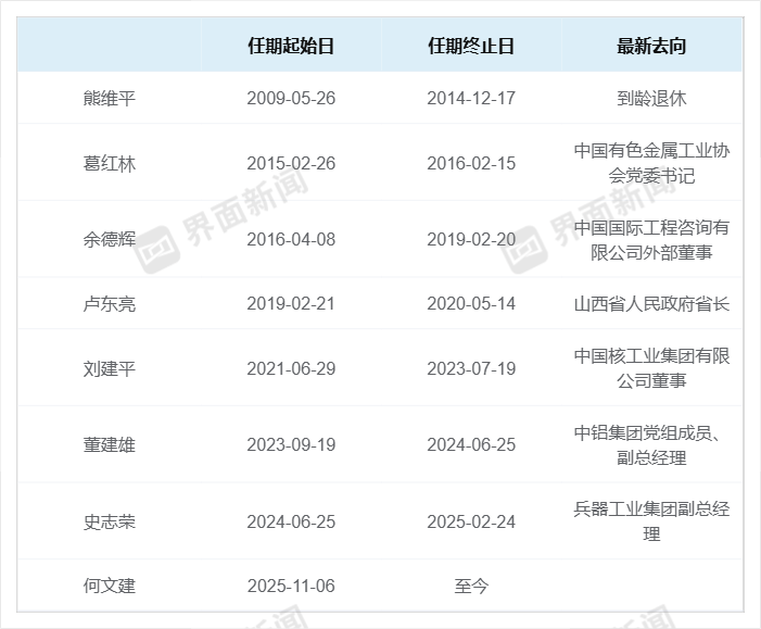 2024年12月,何文建任中国铝业党委书记、总经理;今年3月1日起代行该公司董事长及法定代表人职责。